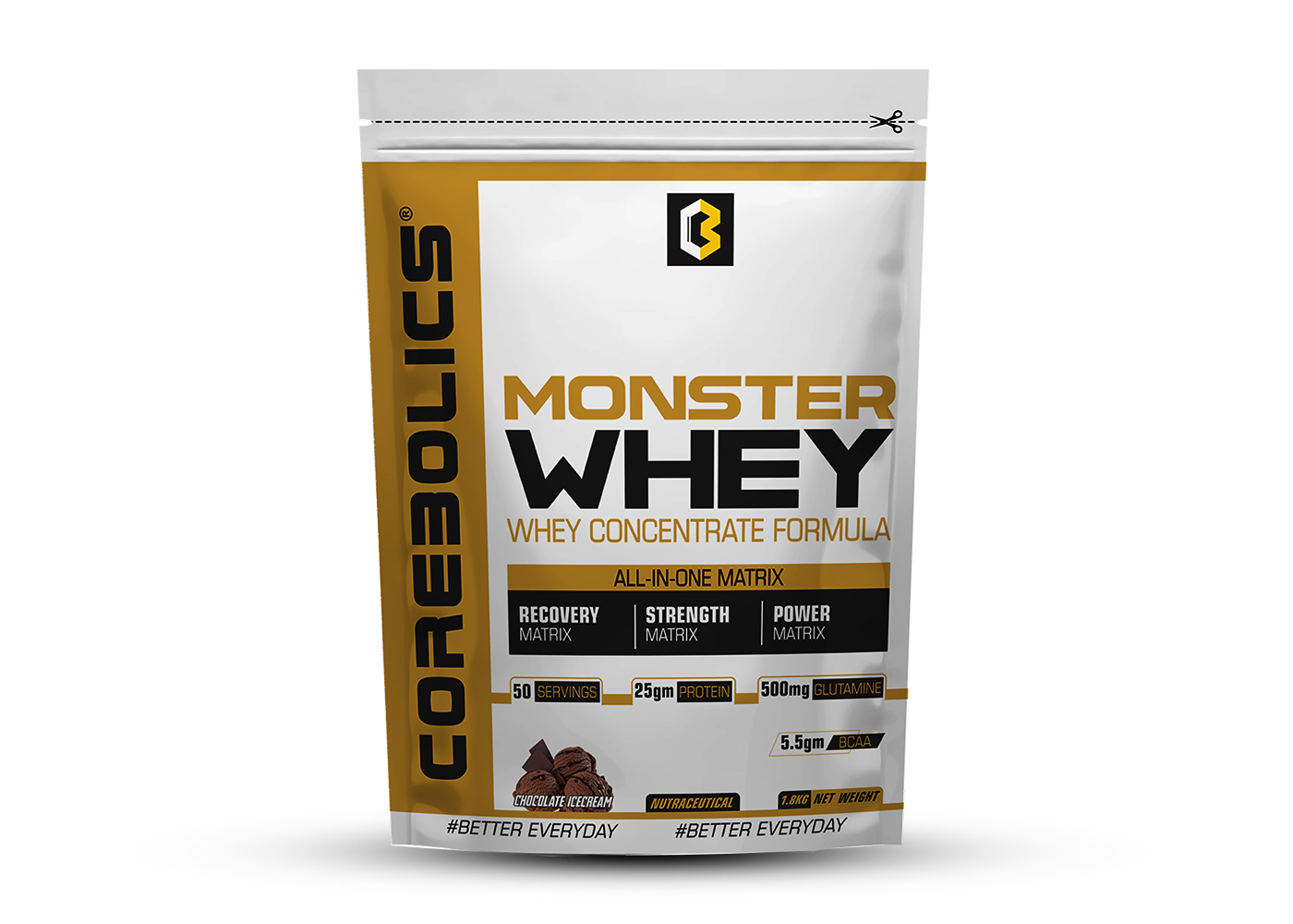 Monster Whey is a high quality whey protein supplement. It contains ultrafiltered low temperature processed and instantized whey protein concentrate (WPC) with a recovery matrix, power matrix and a strength matrix. 'Monster Whey' along with whey protein also delivers, creatine nitrate, l-glutamine. Corebolics designed this product as an "ALL-IN-ONE" matrix. We hereby provide an end to your unlimited search for that perfect combination. It doesn't get better than MONSTER WHEY. This is a perfect "ALL-IN-ONE“ product.