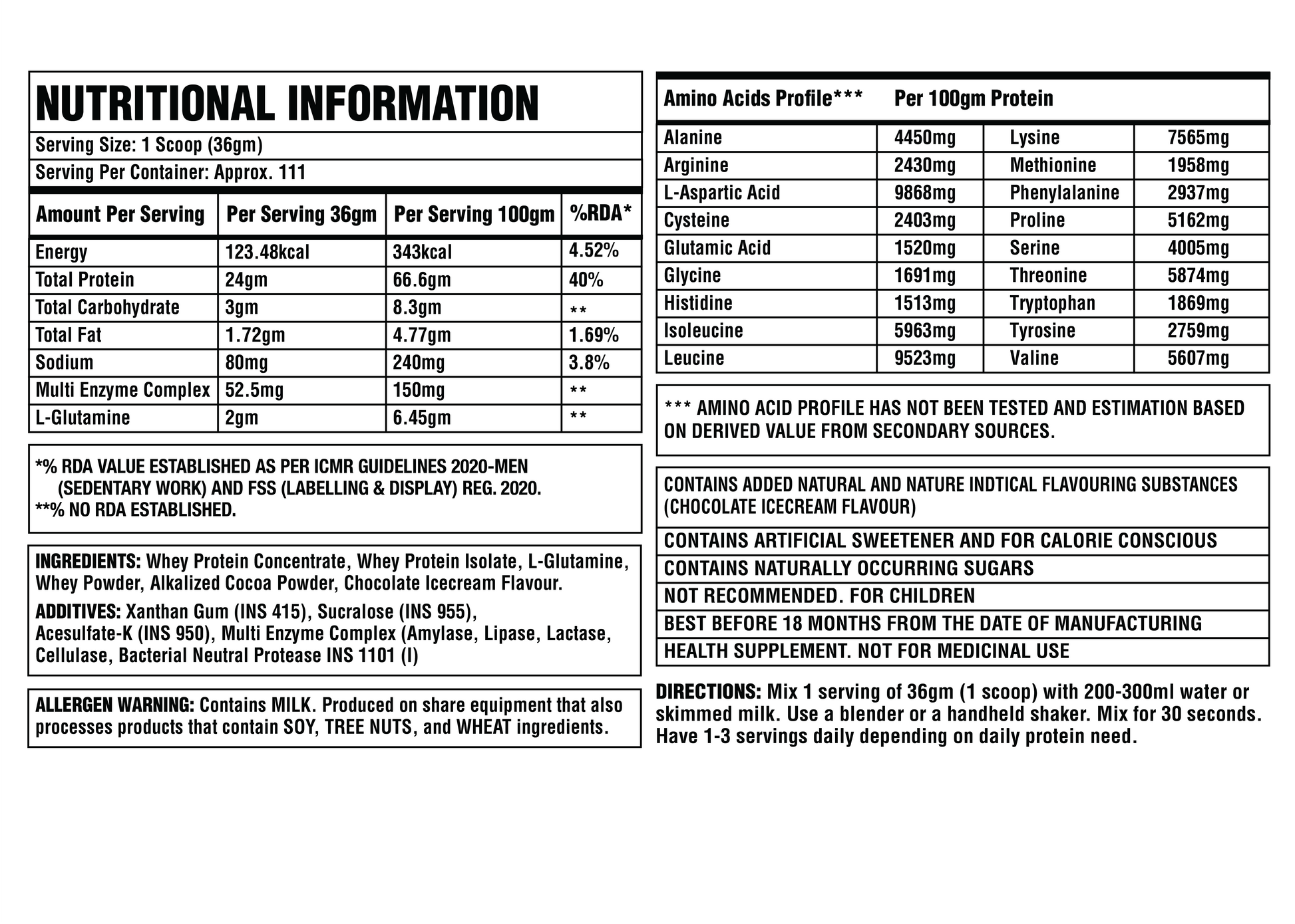 DIRECTIONS: Mix 1 serving 36gm (1 scoop) with 200-300ml water or skimmed milk. Use a blender or a handheld shaker. Mix for 30 seconds. Have 1-3 servings daily depending on daily protein need.