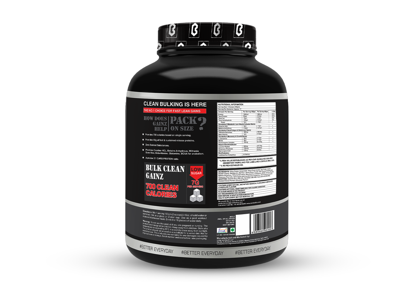 The 700 calories in each serving of COREBOLICS GAINZ PRO come from a well-balanced combination of quick and slow metabolising carbs. This mixture aids in sustaining your calorie intake throughout the day and provides you with enough energy to promote muscular growth and recuperation.