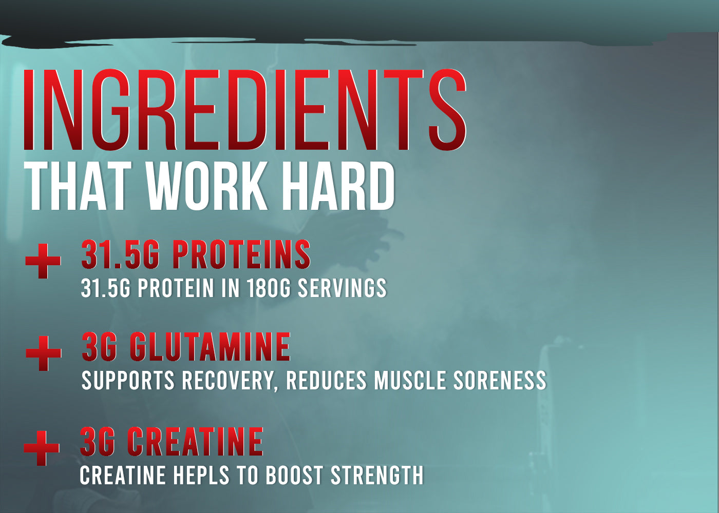 - Each 60 g serving contains 1.5 g of creatine monohydrate and 1 g of L-glutamine.