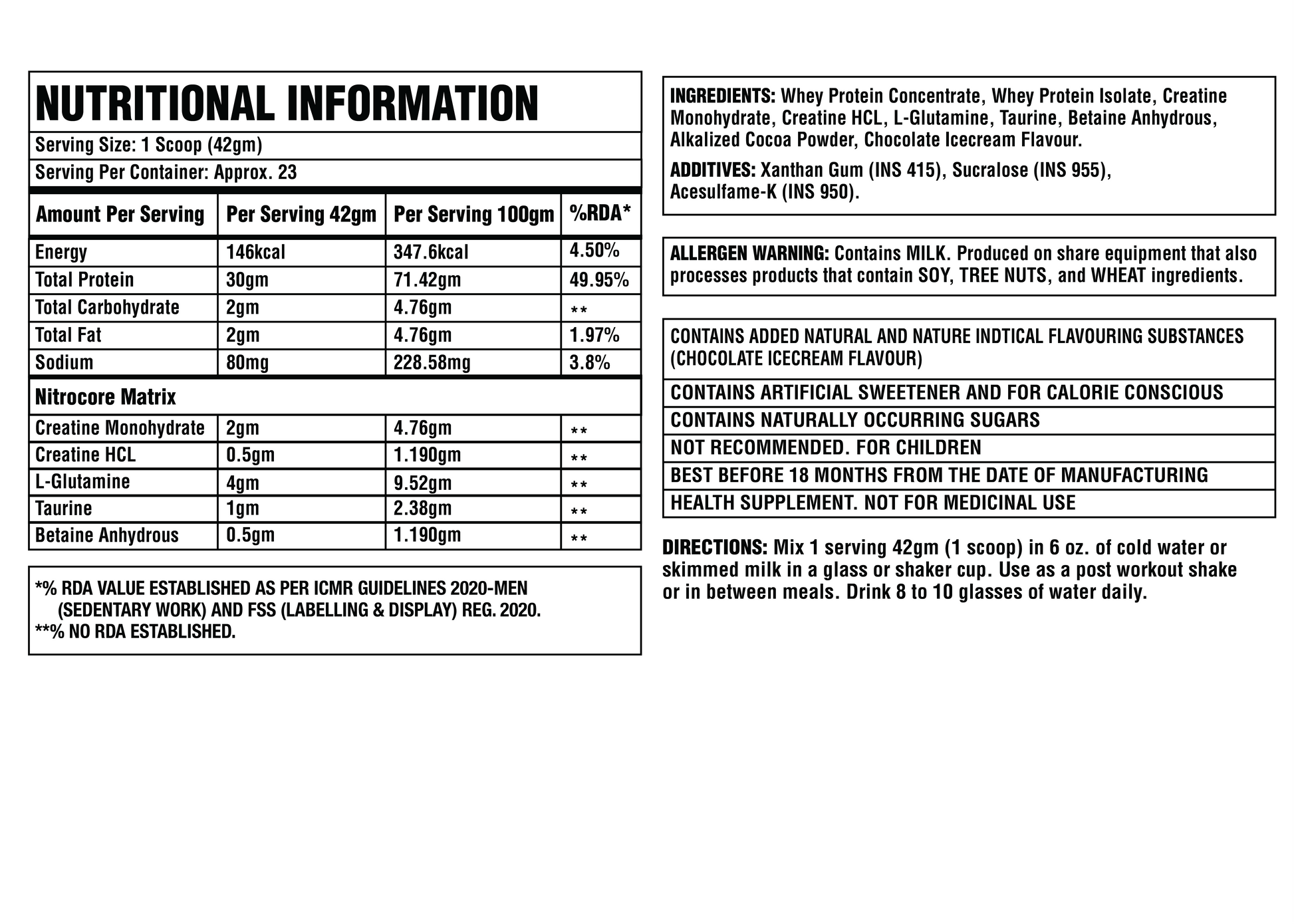 DIRECTIONS: Mix 1 serving 42gm (1 scoop) in 6 oz. of cold water or skimmed milk in a glass or shaker cup. Use as a post workout shake or in between meals. Drink 8 to 10 glasses of water daily.