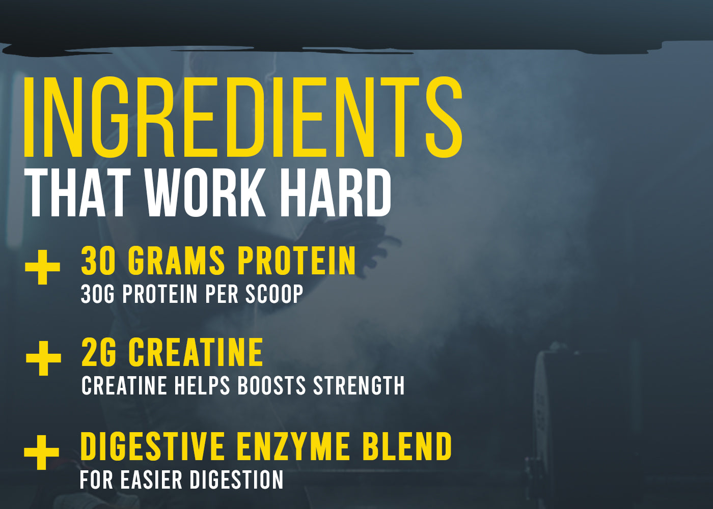 The base is a high quality mixture of proteins in combination with high value components such as (creatine monohydrate, creatine-hcl, l-glutamine, taurine, branched chain amino acids and betaine anhydrous).